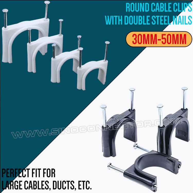 सर्किल केबल क्लिप में बाहरी आवरण के भीतर मध्यम-कार्बन (या उच्च-कार्बन) स्टील की कीलें शामिल हैं। नेल-इन केबल कॉर्ड क्लिप पेशेवर और DIY दोनों कामों में बहुत लोकप्रिय रूप से उपयोग किए जाते हैं, ईथरनेट और ट्यूब को साफ करने से लेकर बाहरी लाइटिंग या बिजली के लिए तारों को चलाने तक। वे बहुत सारे आकार, आकृति और सामग्री के साथ गोल या सपाट डिज़ाइन में उपलब्ध हैं, जो उनकी लोकप्रियता को बढ़ाता है।
