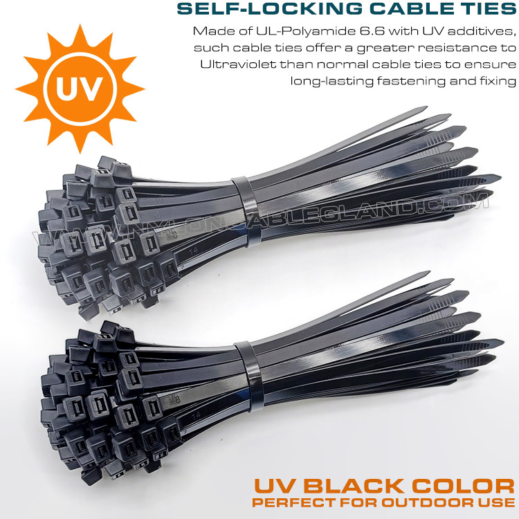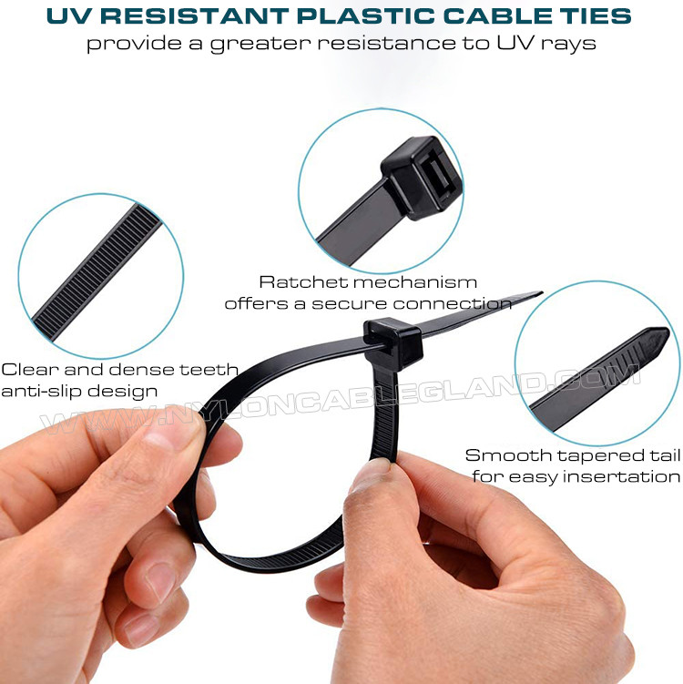 यूवी-प्रतिरोधी केबल टाई एक प्रकार की केबल टाई हैं जो बाहरी और उच्च यूवी वातावरण के लिए डिज़ाइन की गई विशेष सामग्रियों से बनी होती हैं। कार्बन ब्लैक जैसे यूवी-प्रतिरोधी एडिटिव्स को जोड़कर सूर्य की यूवी किरणों का प्रतिरोध करने की उनकी क्षमता को बढ़ाया जाता है। वे दिखने में साधारण केबल टाई की तरह दिखते हैं, लेकिन एडिटिव्स की बदौलत, वे औद्योगिक और दैनिक घरेलू उपयोग दोनों के लिए लंबे समय तक चलने वाले और विश्वसनीय प्रदर्शन प्रदान करते हैं, खासकर बाहरी वातावरण में। यह विभिन्न औद्योगिक परिदृश्यों (जैसे संचार केबल बंडलिंग, सौर पैनल फिक्सिंग) के साथ-साथ दैनिक घरेलू उपयोग (जैसे बागवानी उपकरण बांधना, बाहरी सुविधाओं का रखरखाव) के लिए उपयुक्त है, जो एक टिकाऊ और विश्वसनीय बंडलिंग समाधान है।
