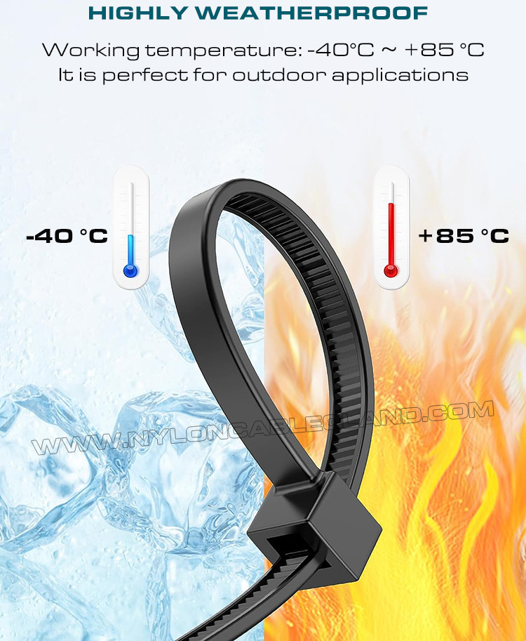 (2) बेहतर यूवी सुरक्षाः यूवी योजक के साथ प्रीमियम ब्लैक पॉलीयामाइड 6.6 (UL 94V-2) से निर्मित, वे मौसम प्रतिरोधी, इन्सुलेटिंग और उम्र बढ़ने के लिए उपयुक्त नहीं हैं।और -40°C से 85°C (40°F - 185°F) के वातावरण में इस्तेमाल किया जा सकता है.