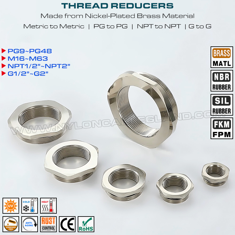 पीतल या स्टेनलेस स्टील 304, 316 या 316L से बने, वे नए मानक फिटिंग हैं जिनका उपयोग थ्रेड के आकार को कम करने, बड़ा करने या अनुकूलित करने के लिए किया जाता है, वे गोल या हेक्सागोनल प्रकार के साथ डिज़ाइन किए गए हैं और मानक आकारों के चयन में उपलब्ध हैं। क्लीयरेंस होल में समान या छोटे आकार के थ्रेड जोड़ें, विभिन्न आकारों या यूनिट सिस्टम के लिए थ्रेडेड होल को अनुकूलित करें, वे ग्रंथियों और छोटे थ्रेड के बीच एक सीधा और विश्वसनीय कनेक्शन विधि प्रदान करते हैं।