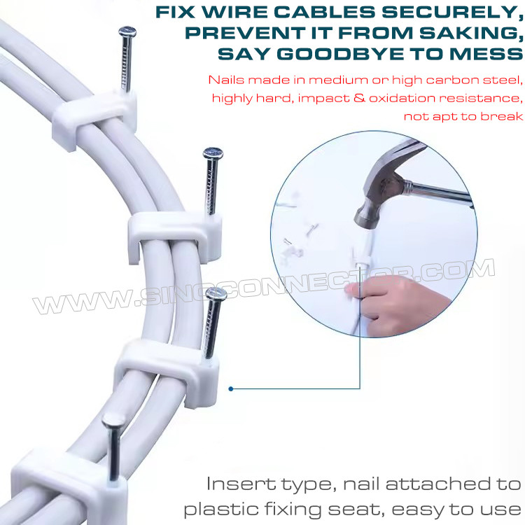 (5) आदर्श विकल्प: केबल क्लिप घर और कार्यालय के विभिन्न केबल प्रबंधन के लिए आदर्श हैं। कॉर्ड के लिए केबल कीलों से जुड़ी कोई भी समस्या होने पर, हम आपको उचित समाधान प्रदान करेंगे। हमें विश्वास है कि आपको हमारे नेल-इन केबल क्लिप पसंद आएंगे।