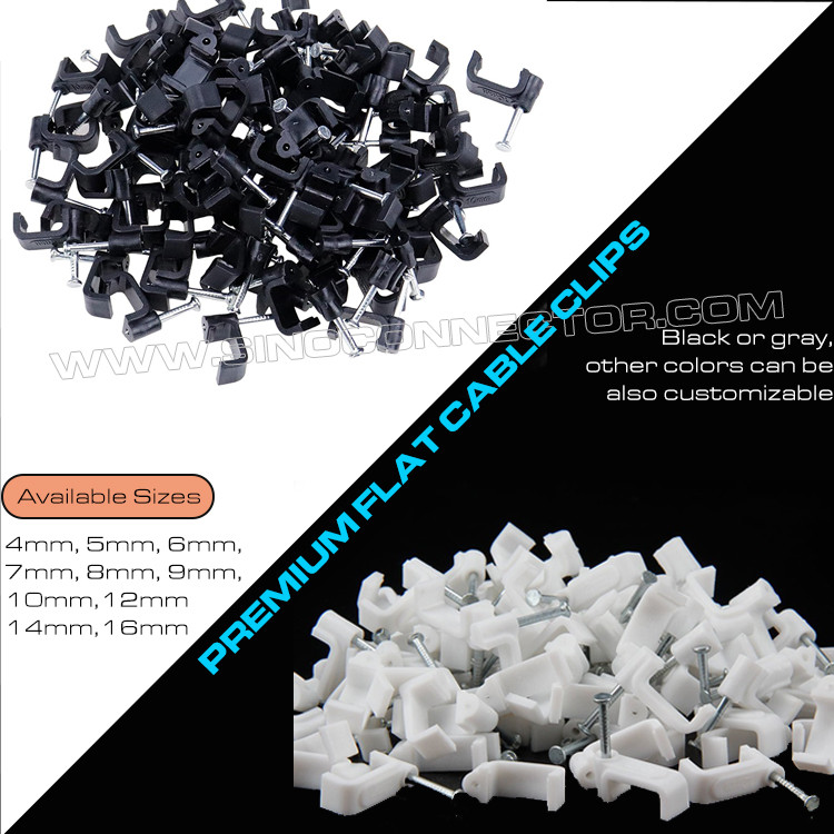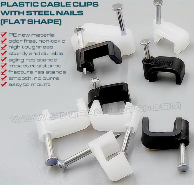 फ्लैट केबल क्लिप में बाहरी आवरण के भीतर मध्यम-कार्बन (या उच्च-कार्बन) स्टील की कीलें शामिल हैं। नेल-इन केबल क्लिप पेशेवर और DIY दोनों कामों में बहुत लोकप्रिय हैं, ईथरनेट और ट्यूब को साफ करने से लेकर बाहरी प्रकाश या बिजली के लिए तारों को चलाने तक। वे कई आकारों के साथ फ्लैट डिज़ाइन में उपलब्ध हैं जो उनकी लोकप्रियता को बढ़ाता है।