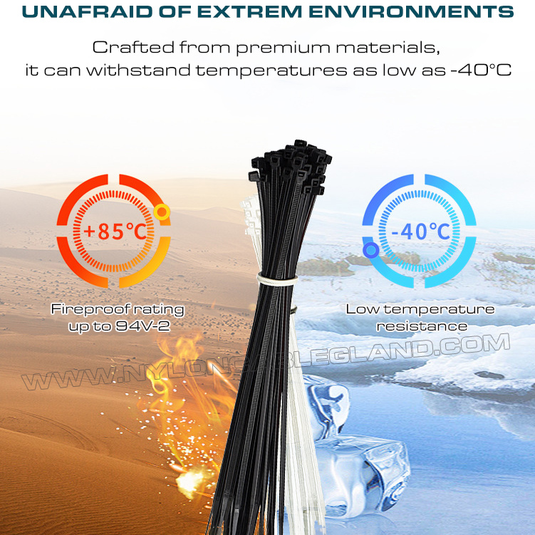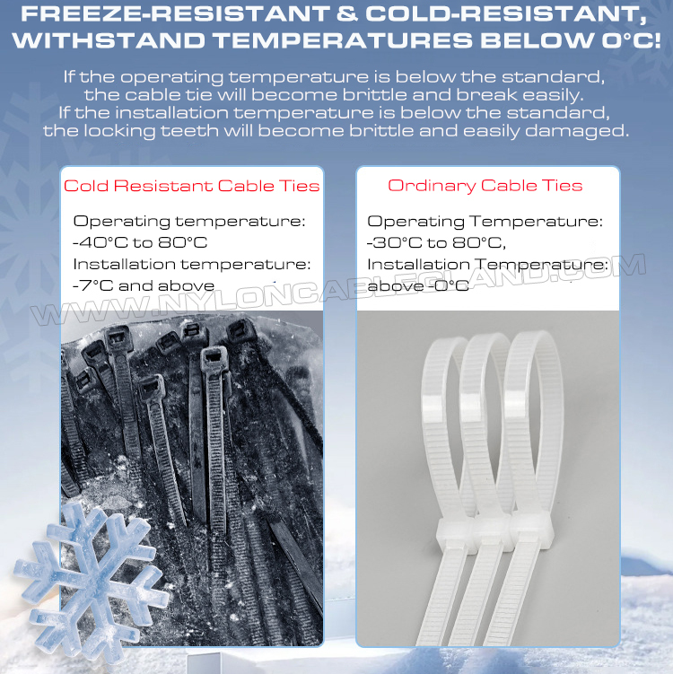 निम्न-तापमान-प्रतिरोधी केबल संबंधों (जिन्हें हिम-प्रतिरोधी केबल संबंध या हिम-प्रतिरोधी ज़िप संबंध भी कहा जाता है) ठंडे वातावरण के लिए डिज़ाइन किए गए नायलॉन केबल टाई हैं। ये निम्न-तापमान-प्रतिरोधी विशेष नायलॉन सामग्री (जैसे संशोधित PA6.6 सामग्री) से बने होते हैं। इनके लाभों में उत्कृष्ट शीत आघात प्रतिरोध (भंगुर विखंडन प्रतिरोध), उच्च शक्ति, उच्च घिसाव प्रतिरोध, अच्छा आयामी स्थायित्व, और उत्कृष्ट रासायनिक प्रतिरोध एवं विद्युत गुण शामिल हैं। ये मानक नायलॉन की तुलना में अत्यंत कम तापमान (जैसे -40°C) पर भी अपनी शक्ति, कठोरता और भंगुर प्रतिरोध बनाए रख सकते हैं। इनका उपयोग विशेष रूप से ठंडे क्षेत्रों या औद्योगिक क्षेत्रों में उपकरणों को ठीक करने के लिए किया जाता है, जहाँ वस्तुओं को मज़बूती से और सुरक्षित रूप से स्थिर रखने के लिए कम तापमान पर सामग्री की आवश्यकता होती है।