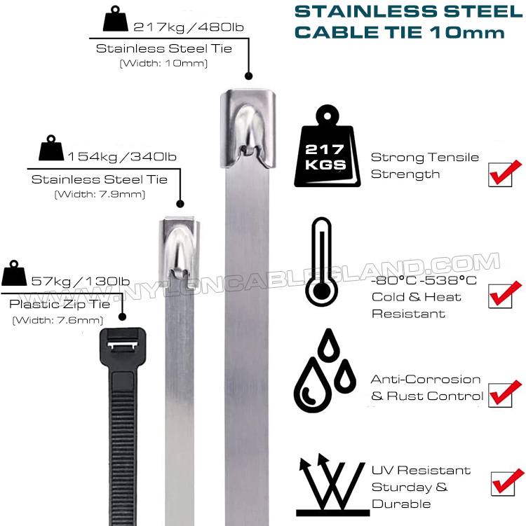 स्टेनलेस स्टील ज़िप संबंध या केबल संबंधों स्टेनलेस स्टील के उत्पाद हैं जिनका उपयोग वस्तुओं को बाँधने और सुरक्षित करने के लिए किया जाता है। चूँकि ये स्टेनलेस स्टील सामग्री से बने होते हैं, इसलिए ये रासायनिक संक्षारण (अम्ल, क्षार, लवण, आदि) के प्रतिरोधी होते हैं। इसके अलावा, स्टेनलेस स्टील केबल टाई बाँधी जाने वाली वस्तु के आकार या आकार तक सीमित नहीं होती हैं। उनकी सरल बकल संरचना पारंपरिक क्लैंप की जटिलता को कम करती है, और उनका उत्कृष्ट बन्धन प्रदर्शन बंधी हुई वस्तुओं की सुरक्षा सुनिश्चित करता है। स्टेनलेस स्टील केबल टाई की संक्षारण-प्रतिरोधी और उच्च-तापमान-प्रतिरोधी सामग्री सौंदर्य अपील भी सुनिश्चित करती है और अग्नि सुरक्षा आवश्यकताओं को पूरा करती है।
