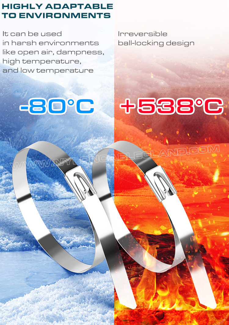 स्टेनलेस स्टील केबल संबंधों, जिन्हें मेटल केबल संबंधों भी कहा जाता है, उच्च गुणवत्ता वाले स्टेनलेस स्टील से बने एक प्रकार के बन्धन पट्टियाँ हैं। सबसे आम प्रकार बॉल-लॉकिंग मैकेनिज्म वाला स्टेनलेस स्टील केबल टाई है, जिसका चतुराई से डिज़ाइन किया गया बॉल हेड बिना किसी उपकरण के आसानी से बन्धन की अनुमति देता है।